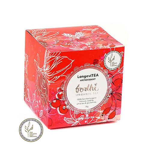 This is our multi-award winning antioxidant tea, made with herbs abundant in powerful antioxidants and vitamin C that help promote healthy skin, and reduce the risk of premature ageing and chronic diseases like cancer, and heart disease. A perfect antioxidant tea blend of sweet and tartness to delight and enliven the senses. This ruby red tea is refreshing with subtle fruity undertones. Perfect served hot or as an iced tea with fresh lime or citrus fruits. LongeviTEA received three gold and a silver Golden leaf awards at the Australian International Tea Expo in 2017, 2018, 2020, and 2022.